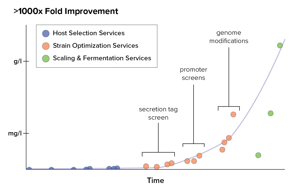 Strain Optimization Services steadily improved the target protein’s titer while providing our partners with valuable information about what improvements could be expected.
