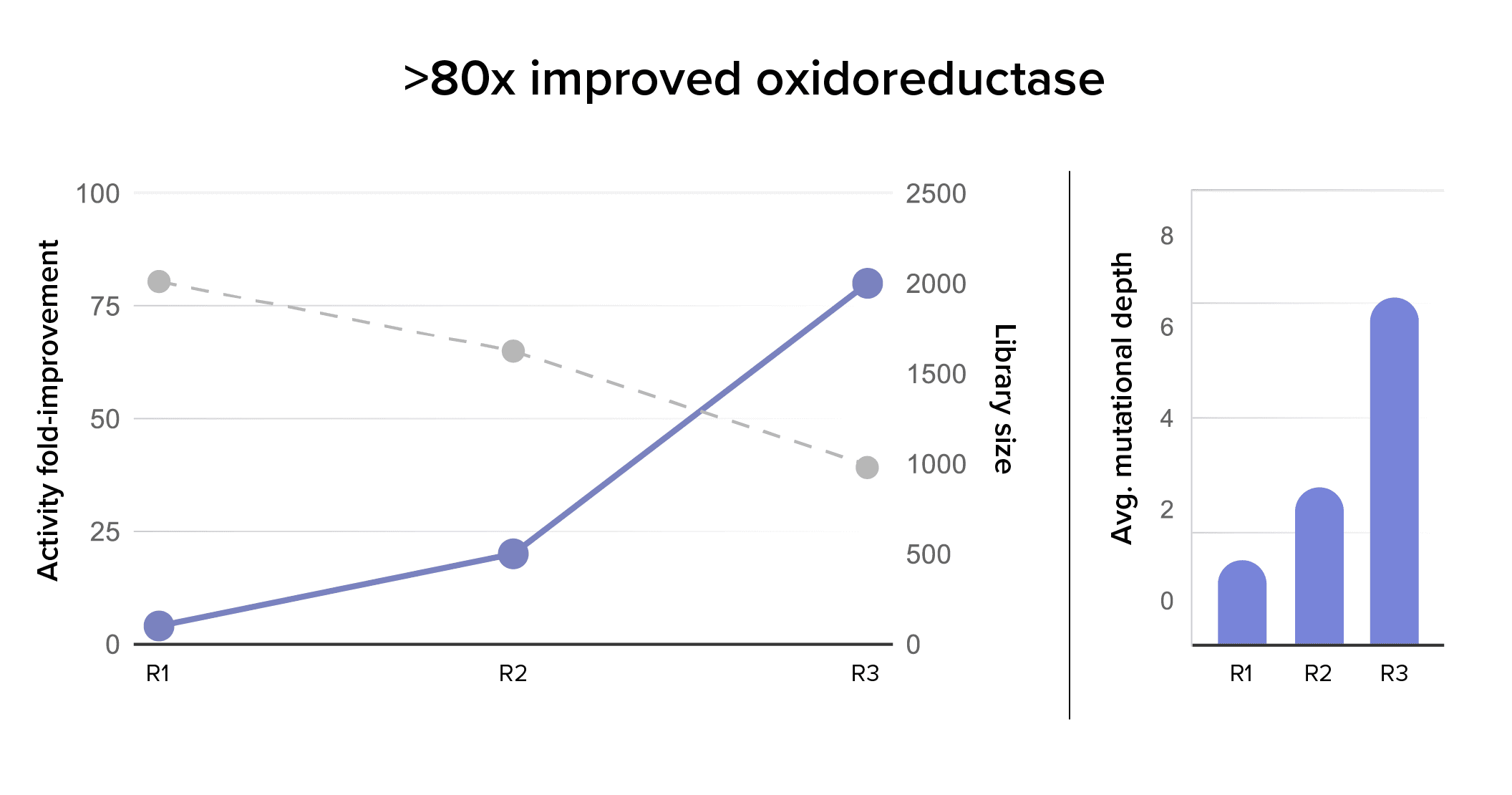 Generation 2: With our learnings from Generation 1 and our metagenomic campaigns, we leveraged our proprietary OWL technology to engineer enzymes with improved activities.. Our previous campaigns developed a rich data set informing how enzyme sequence affected productivity and selectivity. OWL leveraged this data set to predict which enzymes would have better function. Result: We engineered enzyme sequences with a ~20x improvement in productivity and a 2.5x improvement in selectivity over the starting point.